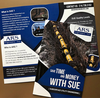 We worked with ARS Engineers to create a website, logo, banners, and bifold brochures that explained their SUE (Subsurface Utility Engineering) services. We also helped write the copy, including the "We find utilities so you don't find them the hard way" tagline.